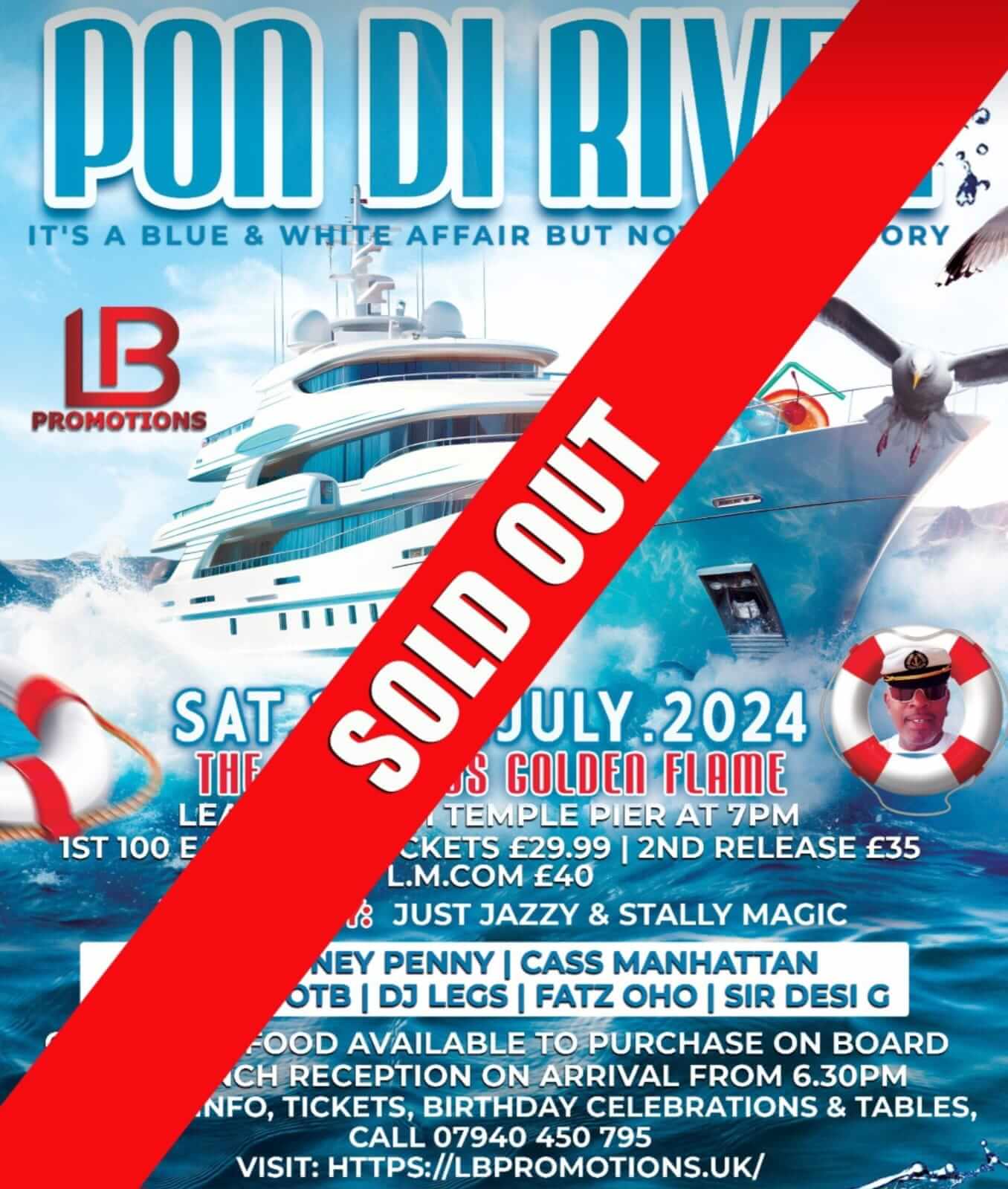 LB Promotions presentsPON DI RIVERIt’s A Blue and White Affairfeaturing* CASS MANHATTAN* CHAIRMAN OTB* DJ FATZ OHO* DJ LEGS* SIR DESI G* MISS MONEY PENNYHosted by JUS JAZZCaribbean food available to purchase on board, Rum Punch reception on arrival.Boarding at 6:30pm.For more info. Birthday celebrations and tables call the Hotline 07940 450 795