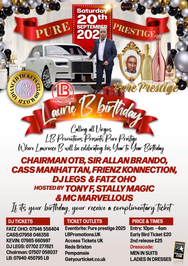Calling all Virgos LB Promotions Presents Pure Prestige: Where Lawrence B will be celebrating his Year to Year Birthday on Saturday 20th Sept 2025 @ The Luxurious Regency Banqueting Suite, Bruce Grove , N17 6UR .